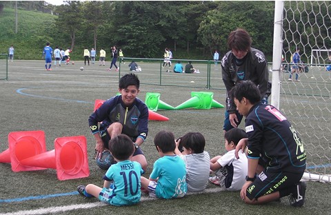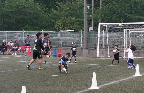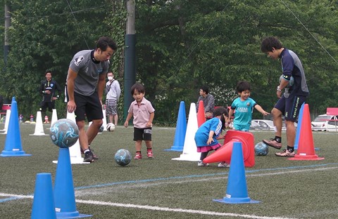 年少、年中、年長と3カテゴリーに分かれ、クリニックを進めていきました。 最初は、緊張した表情でいた子供たちもコーチたちと一緒に動いていく中で、笑顔でプレーしていました。 コーチたちの元気に負けないように、子供たちも元気にボールを追いかけていました。